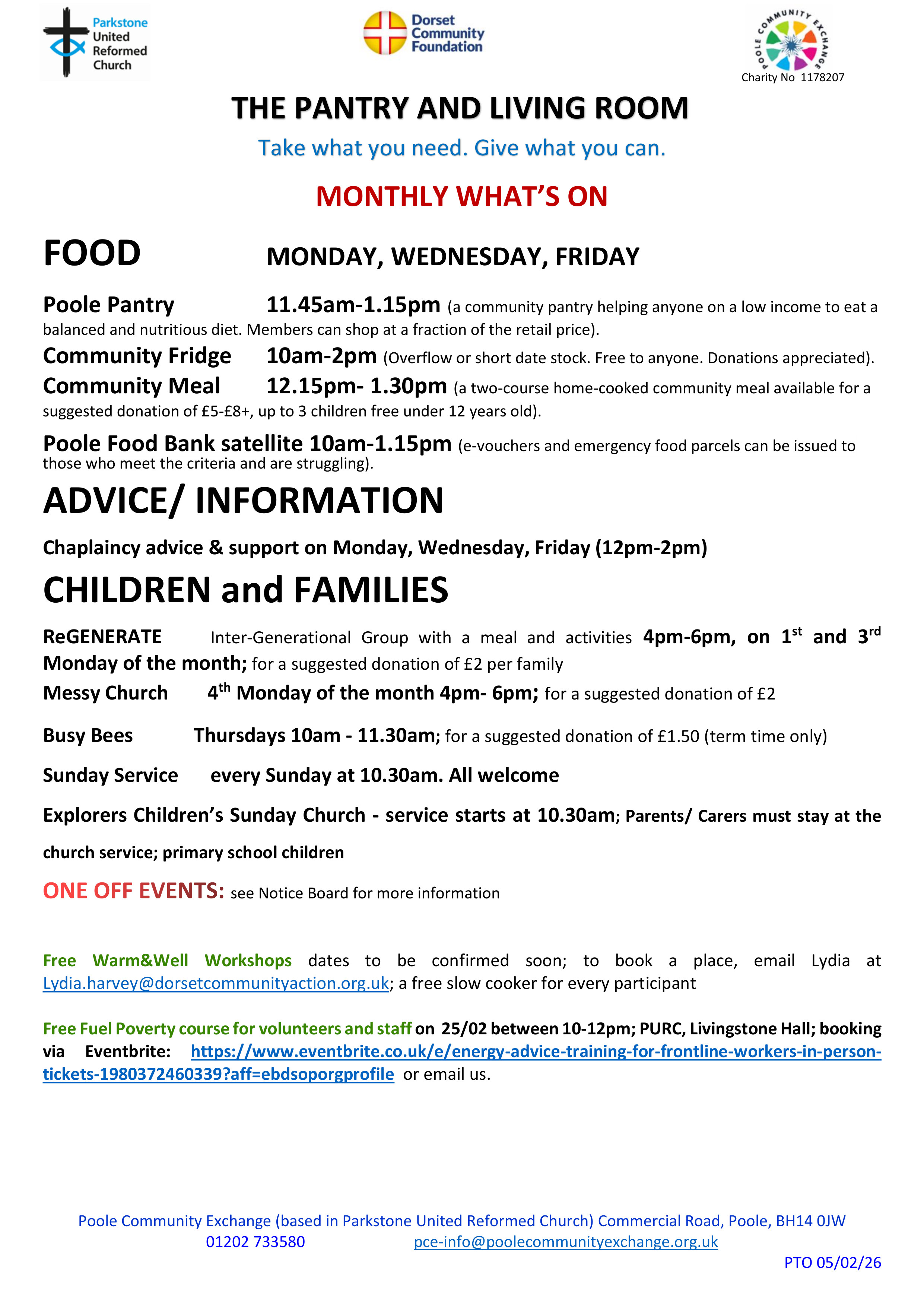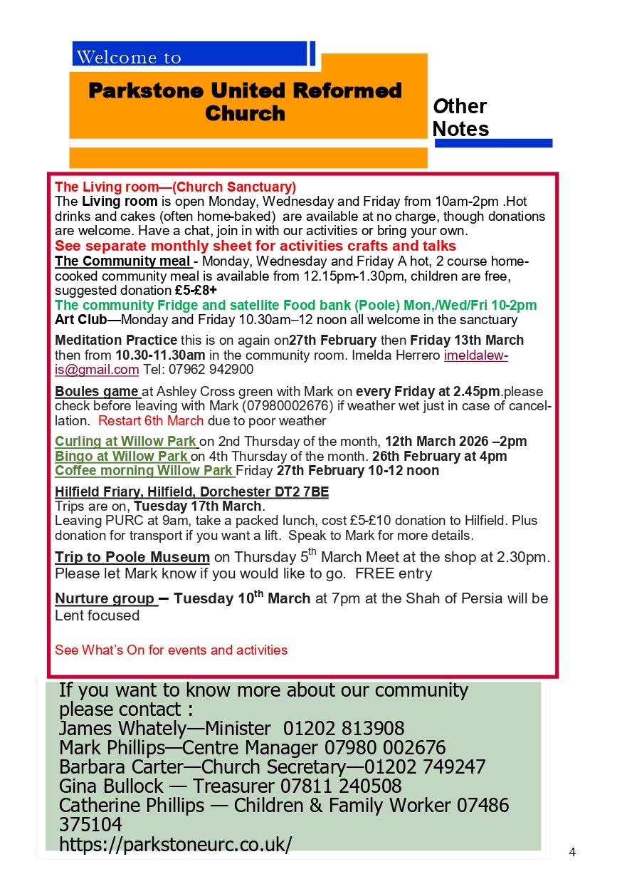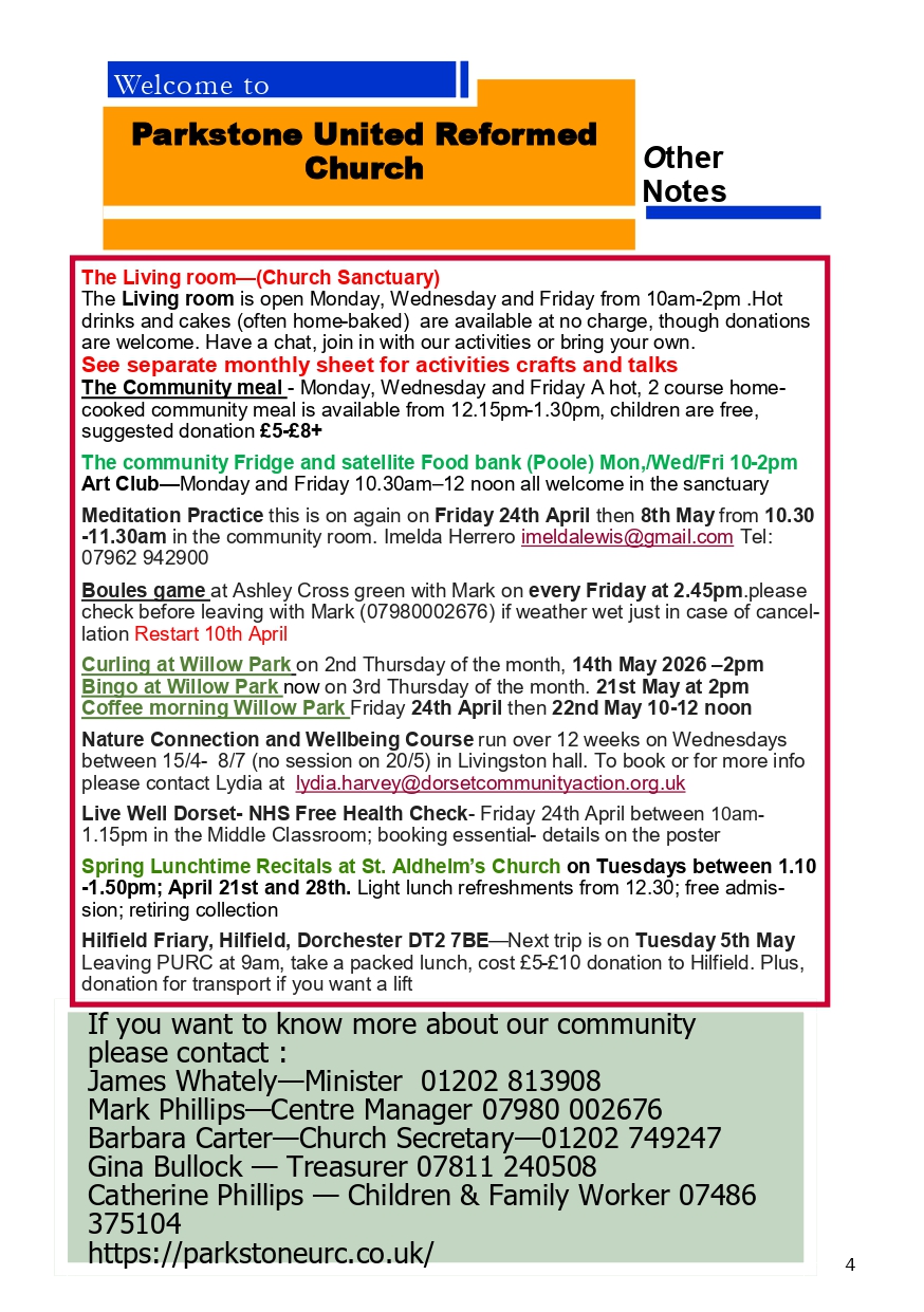 the Church as a whole.Extremely active within the Lower Parkstone and Poole area the Church is well known as a friendly meeting house and support location to many local groups and organisations – both Faith Groups and Community Groups