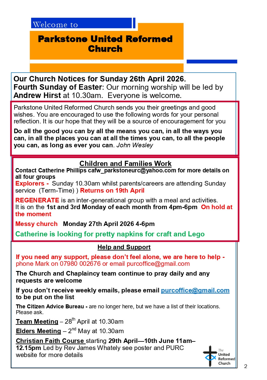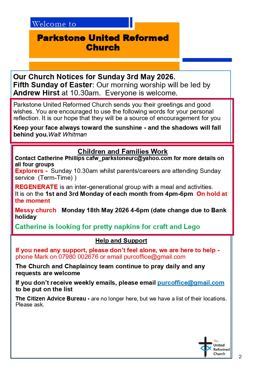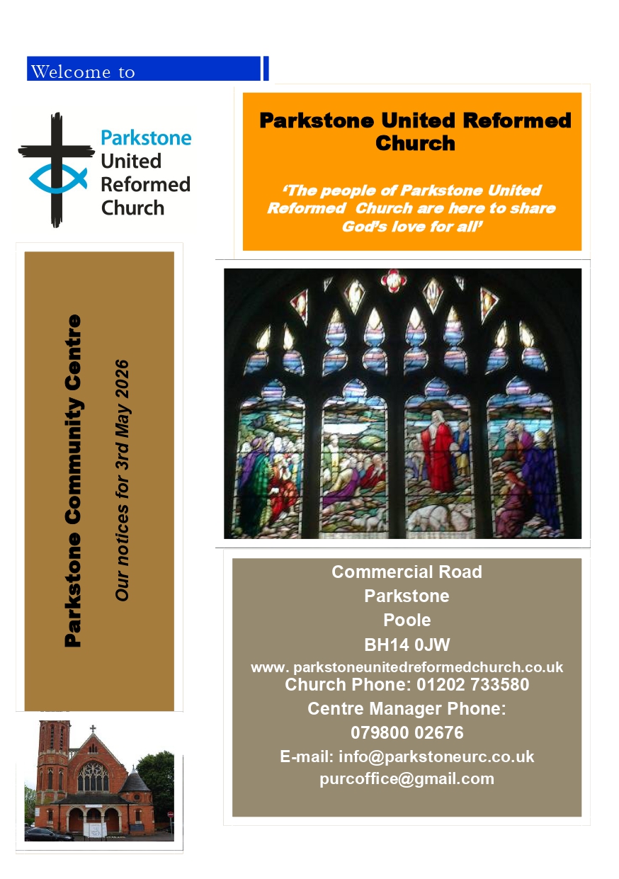 .Our Mission Statement is..."The people of Parkstone United Reformed Church are here to share God's love for all through welcome, service and care."Our Vision Statement is...Because of this understanding of who we are and what we are here