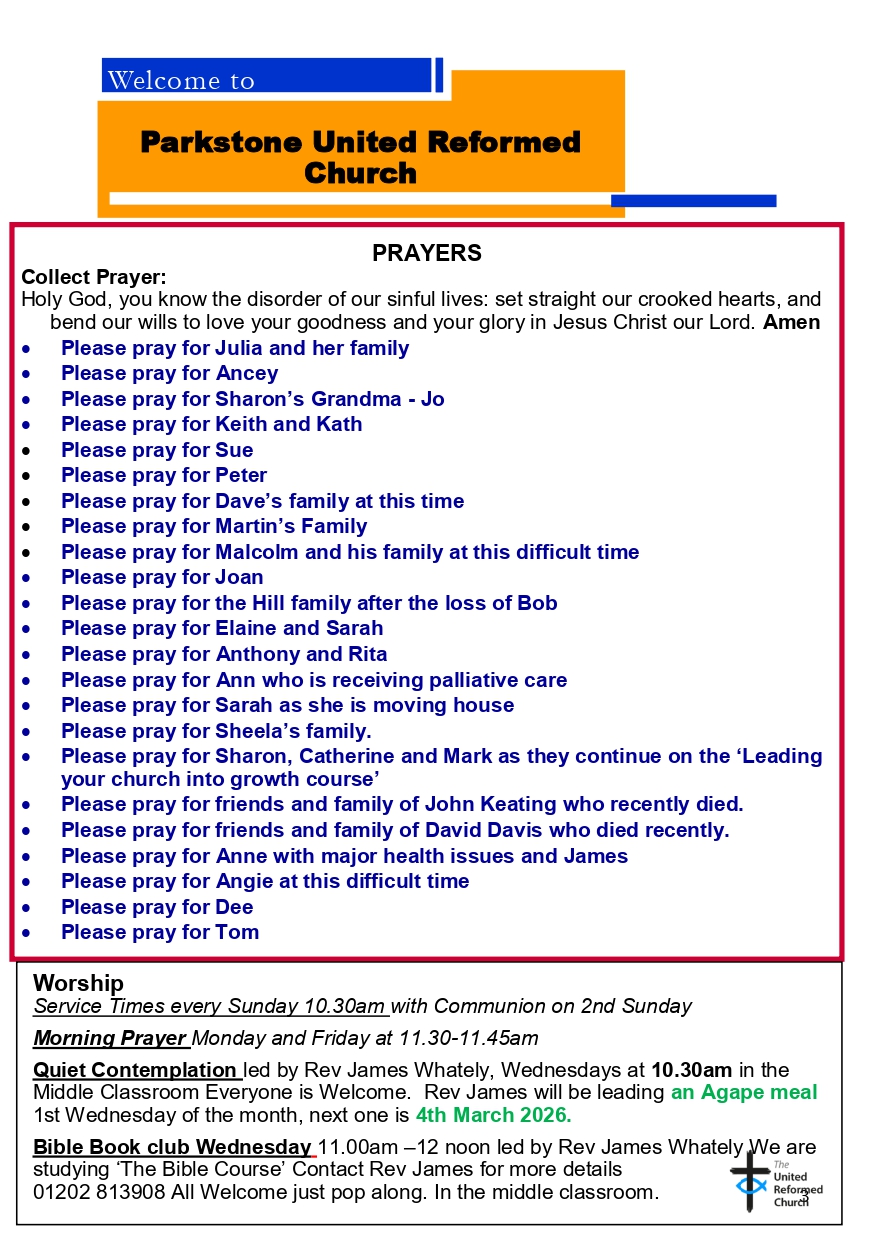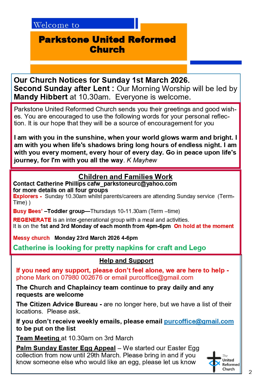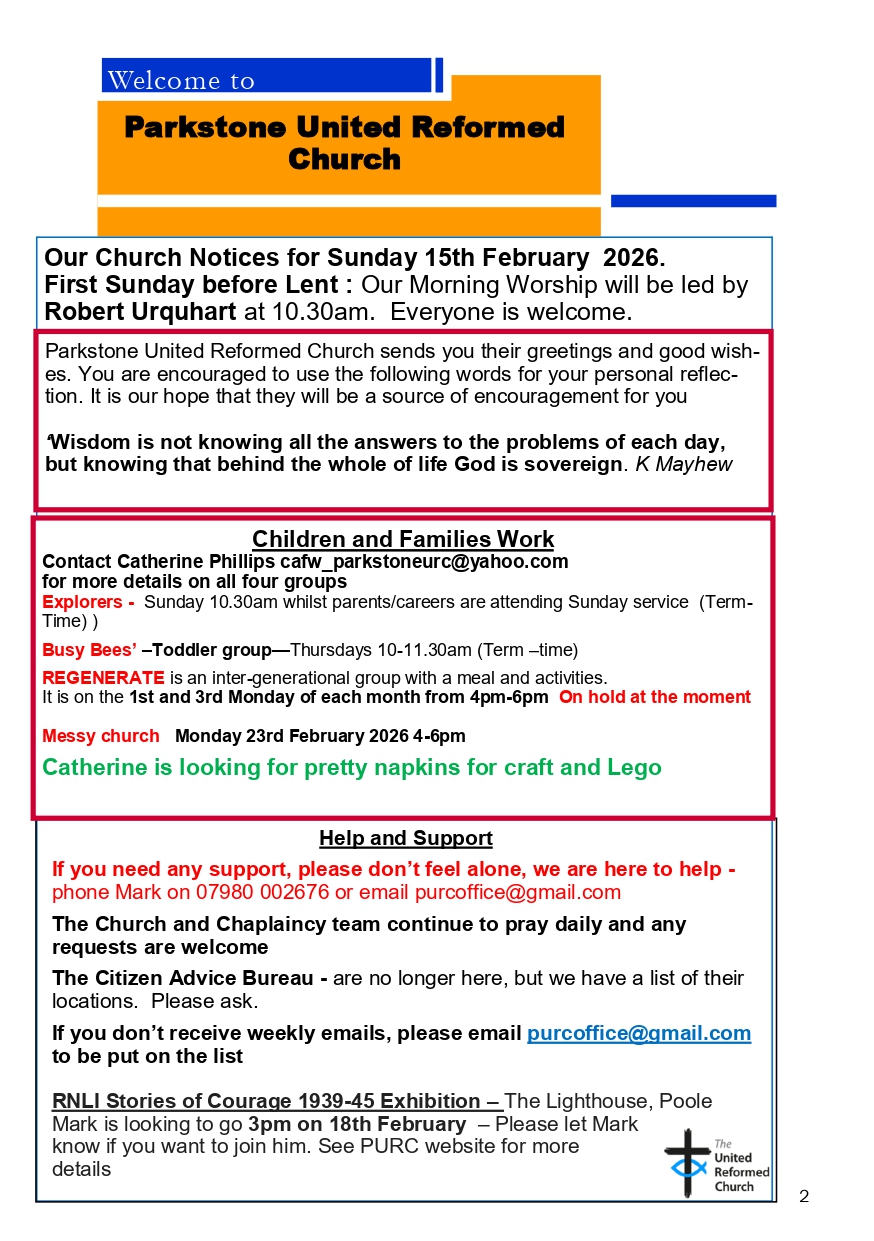 .Our Mission Statement is..."The people of Parkstone United Reformed Church are here to share God's love for all through welcome, service and care."Our Vision Statement is...Because of this understanding of who we are and what we are here