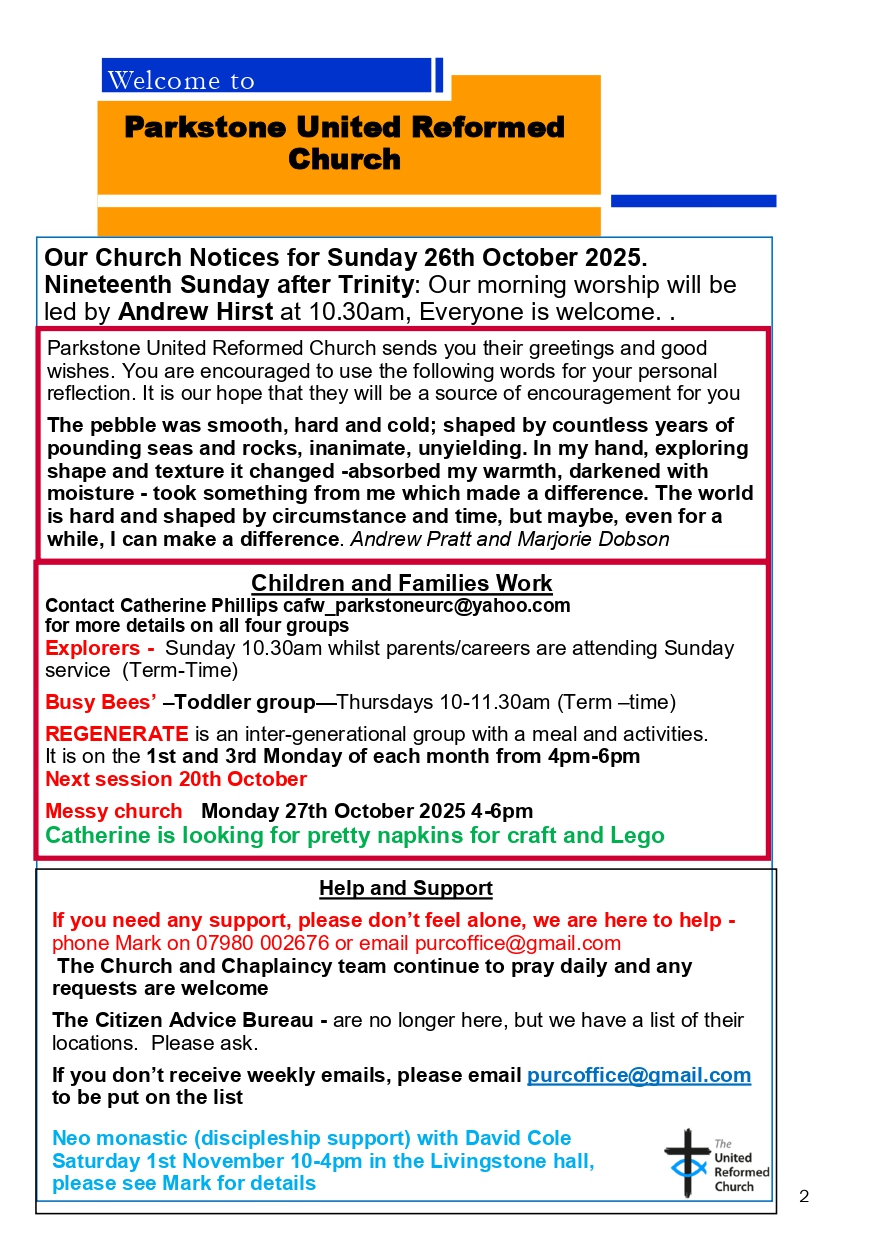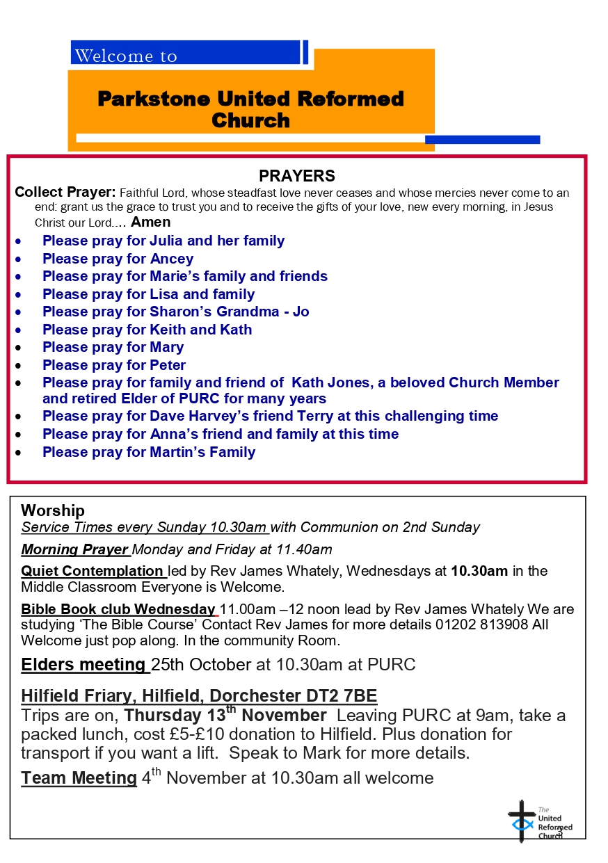 .Our Mission Statement is..."The people of Parkstone United Reformed Church are here to share God's love for all through welcome, service and care."Our Vision Statement is...Because of this understanding of who we are and what we are here